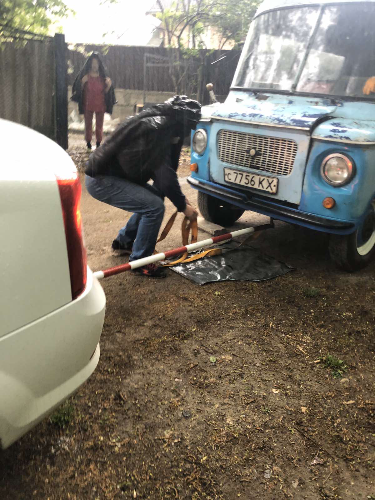 Приехали на дачу, выкатили Нысу задом из ворот, прицепили жесткую сцепку к петле передней подвески и фаркопу легковушки, продублировали крюками буксировочного троса, обмотав тросом и саму трубу сцепки, протянув пару метров туда-обратно для проверки функционирования буксира, и выдвинулись в путь...