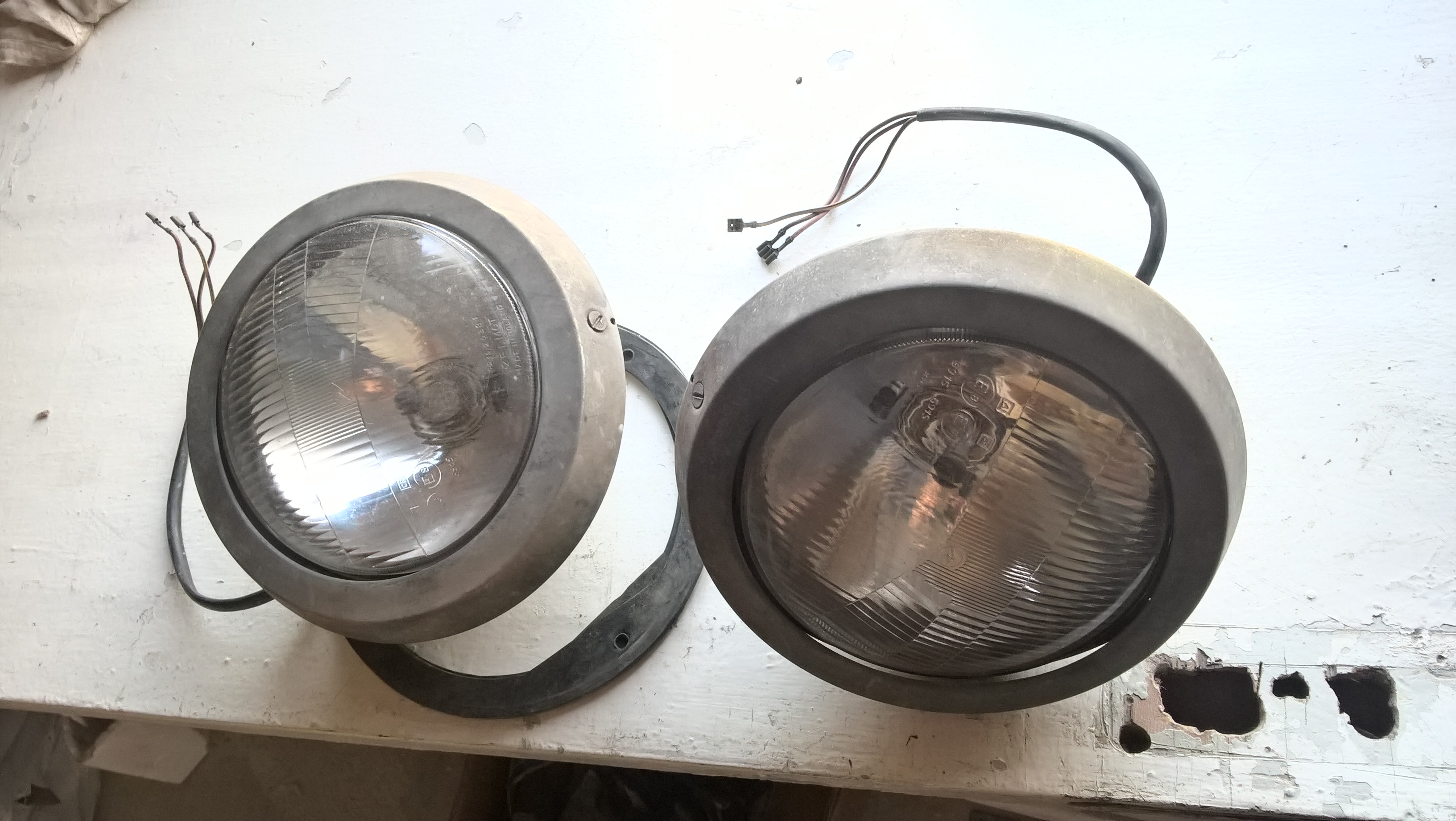 прикупил при случае для Жука пару родных фар в комплекте с горшками, ободами, проводкой и галогеновыми лампочками. Напомню у меня сейчас установлены от МАЗ/ГАЗ вместе с ихними горшками.