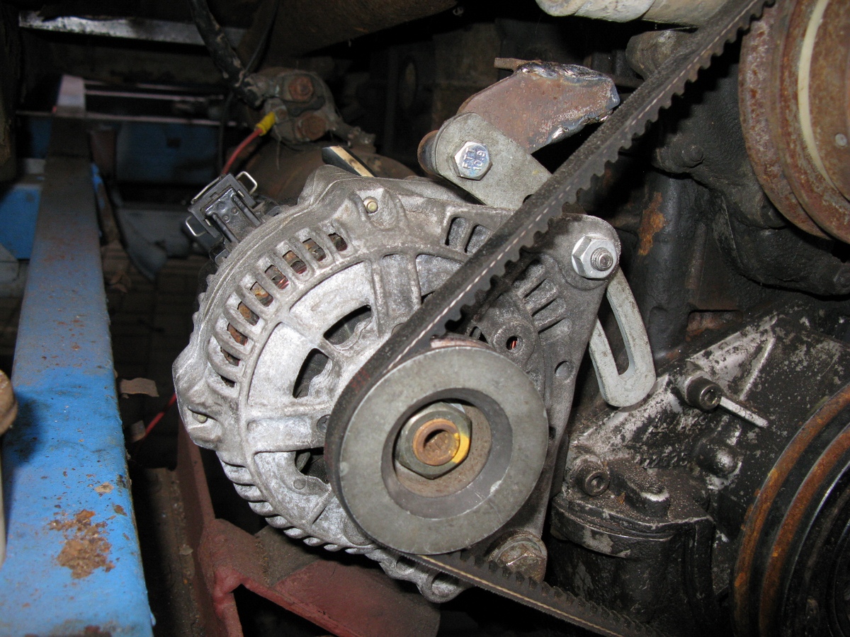 Физическое внедрение генератора от Гольф-3 90А. Изготовлен верхний кронштейн, с использованием некоторых заводских деталей, переделано нижнее ухо, с креплением к блоку на родной кронштейн.