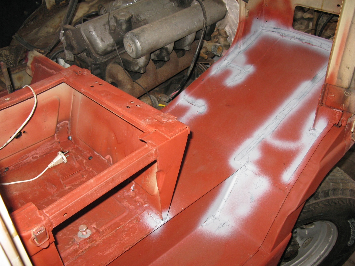 Сусанин, конечно можно. Грунт антикорозионный Novol, герметик полиуретаноый для сварных швов. Конечно по-хорошему этот грунт надо бы сразу перекрыть уже простым грунтом-наполнителем, но дело было в декабре, поэтому тогда не стал этого делать, только по швам прошелся. Постамент под сиденье пассажира усилил и примерил сиденье от мультивана Т-3, которое будет легко откидываться и сниматься. Крепеж под него уже сделан. Раздатка кстати, вопреки опасениям газоводов переключается нормально. На кулисе КПП тоже усилие приемлемое и сама ручка не массивная, а из нержавейки тонкой. Сделана съемной, для легкости снятия-установки КПП.
