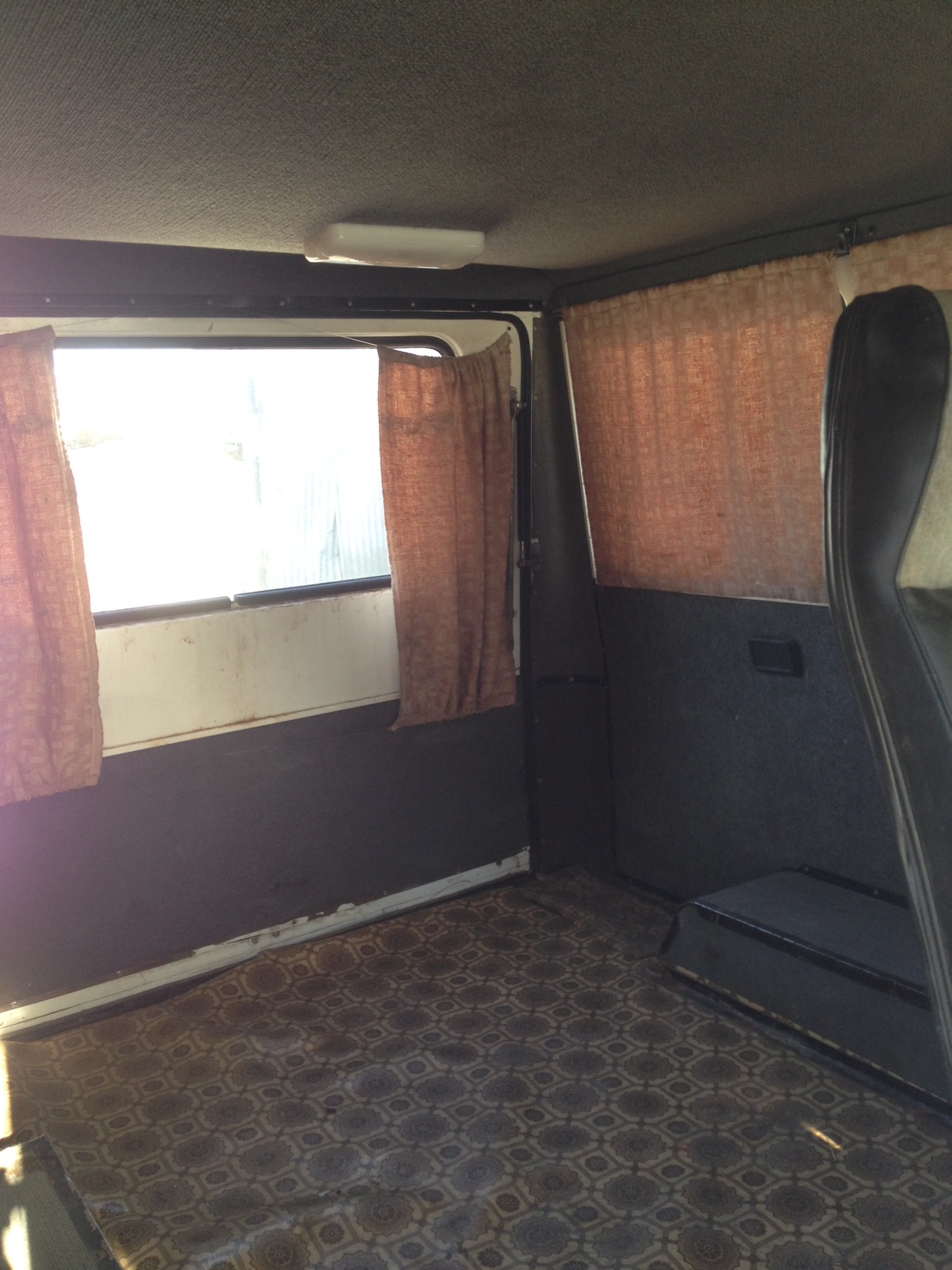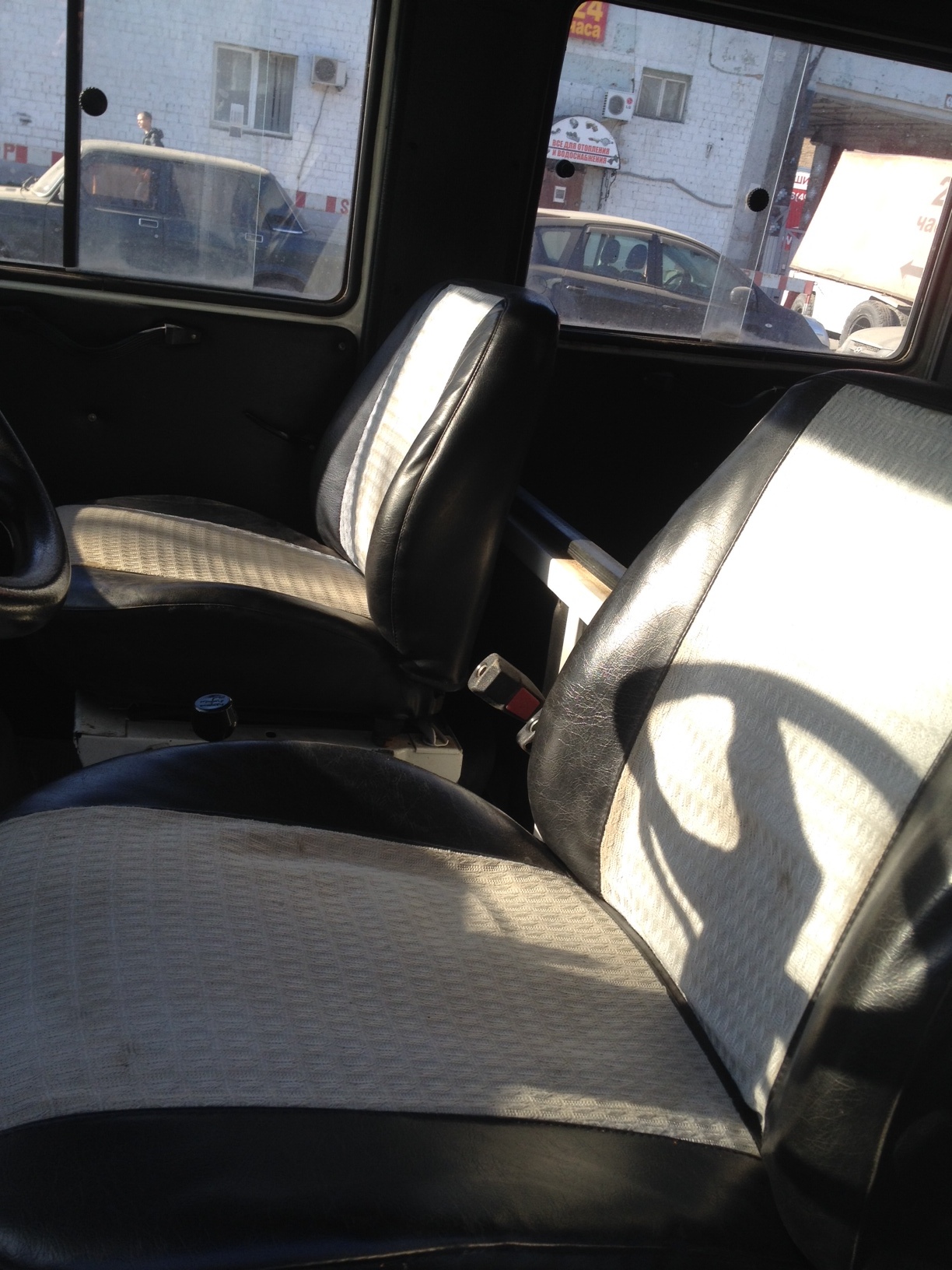 По документам категория D, на табличке написано 8+1 место. Задних сидений только два, добротные, с высокой спинкой и подголовником. Установлены за водителем прямо над печкой. На полу линолеум, но под ним родное покрытие пола в полном сохране. Обшивки дверей из черного кожзама (на водительской есть лоточек для барахла), потолок и стенки обшиты чем-то похожим на жесткий ковролин серого цвета на оргалитной основе. На потолке два больших плафона освещения, по три или четыре лампы в каждом, включаются по половине. В пассажирском отсеке семь пепельниц! (чистые пустые или с шурупчиками и ниппелями).
