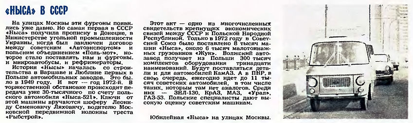 В те годы журнал «За рулем» писал: «Привычными уже стали на наших дорогах польские автомобили. Это грузовики и фургоны «Жук» для перевозки мелких партий грузов, 10-местные микроавтобусы и фургоны-рефрижераторы «Ныса». Последний вмещает около 850 килограммов свежих скоропортящихся продуктов, а в зимнее время в изотермическом кузове можно перевозить фрукты, боящиеся мороза. «Ныса» весьма маневренна, что очень важно в условиях города».