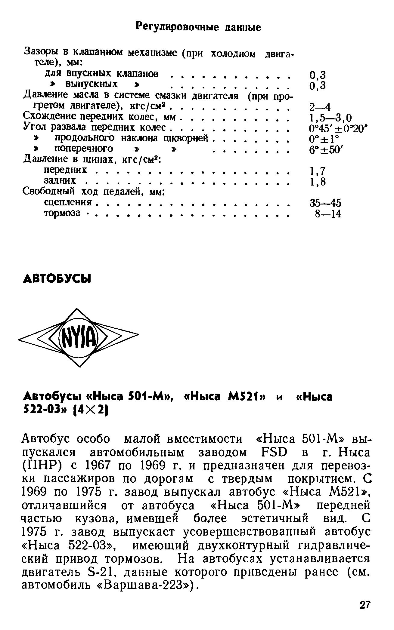 В 1951 г. в Польской Народной Республике на бывшей фабрике металлической мебели в городе Ныса, расположенном на юге страны, было решено наладить выпуск автомобильных кузовов. По прошествии некоторого времени, ровно полвека тому назад, завод полностью переориентировали на производство автомобилей, а точнее – микроавтобусов. Самые первые автомобили (серии «N57») появились осенью 1957 г. Это были легкий развозной фургон и восьмиместный микроавтобус. По имени города они и получили марку «Ныса». Однако сама конструкция этих микроавтобусов была разработана не в Нысе, а появилась на свет в столице, на Варшавском автозаводе ФСО (FSO). Именно там спроектировали лонжеронную раму и цельнометаллический каркасный кузов, широко использовав при этом агрегаты легкового автомобиля «Варшава М20» – польского варианта советской «Победы» ГАЗ М-20. Соответственно, микроавтобус имел однодисковое сцепление и трехступенчатую коробку передач. Передняя независимая подвеска была выполнена на двойных поперечных рычагах, задняя представляла собой жесткую балку на полуэллиптических рессорах. На «Нысе» применялась гидравлическая тормозная система.