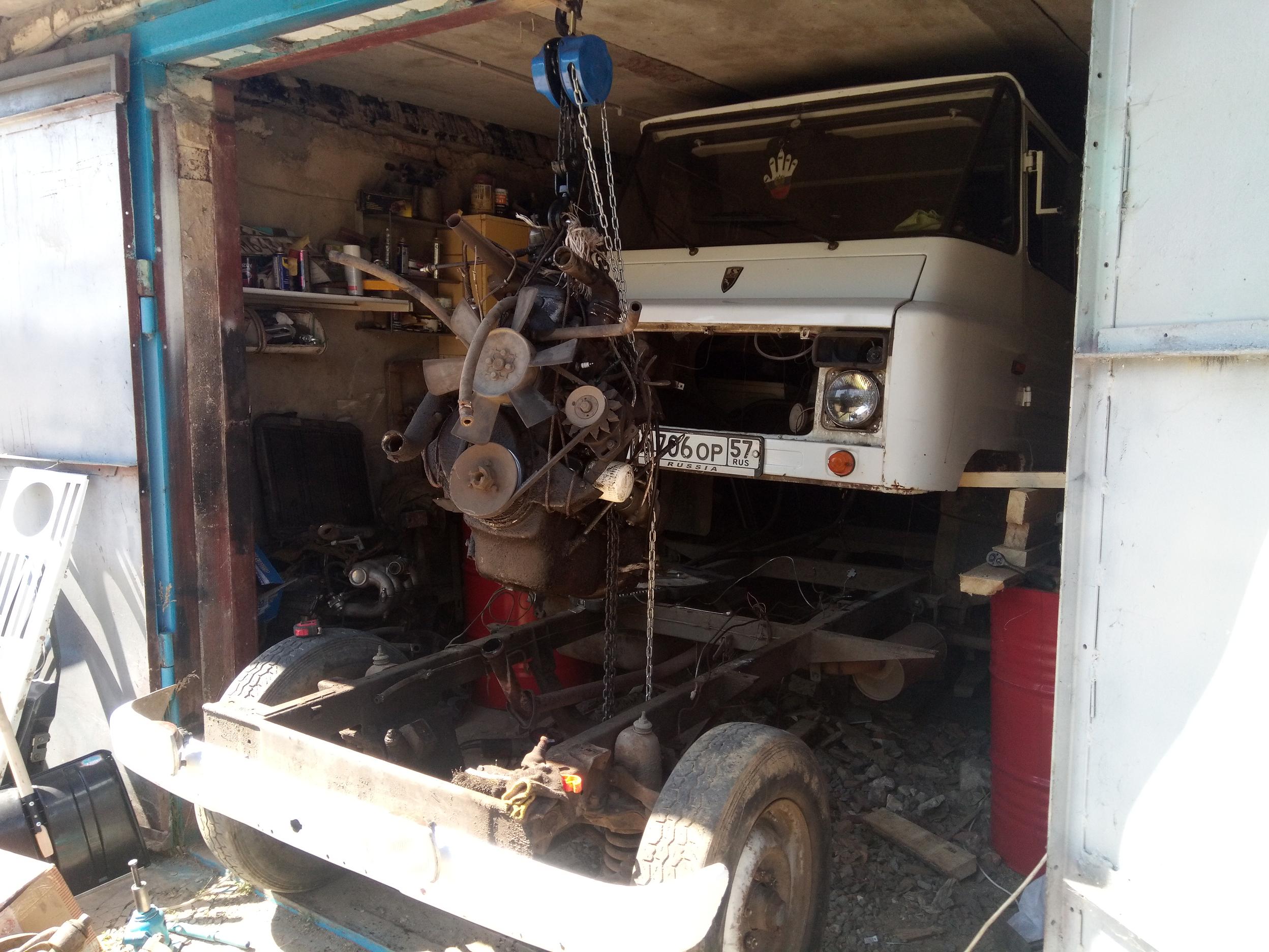 Высоты подъёма кузова, как раз хватило, чтобы выкатить раму, вместе с двигателем.