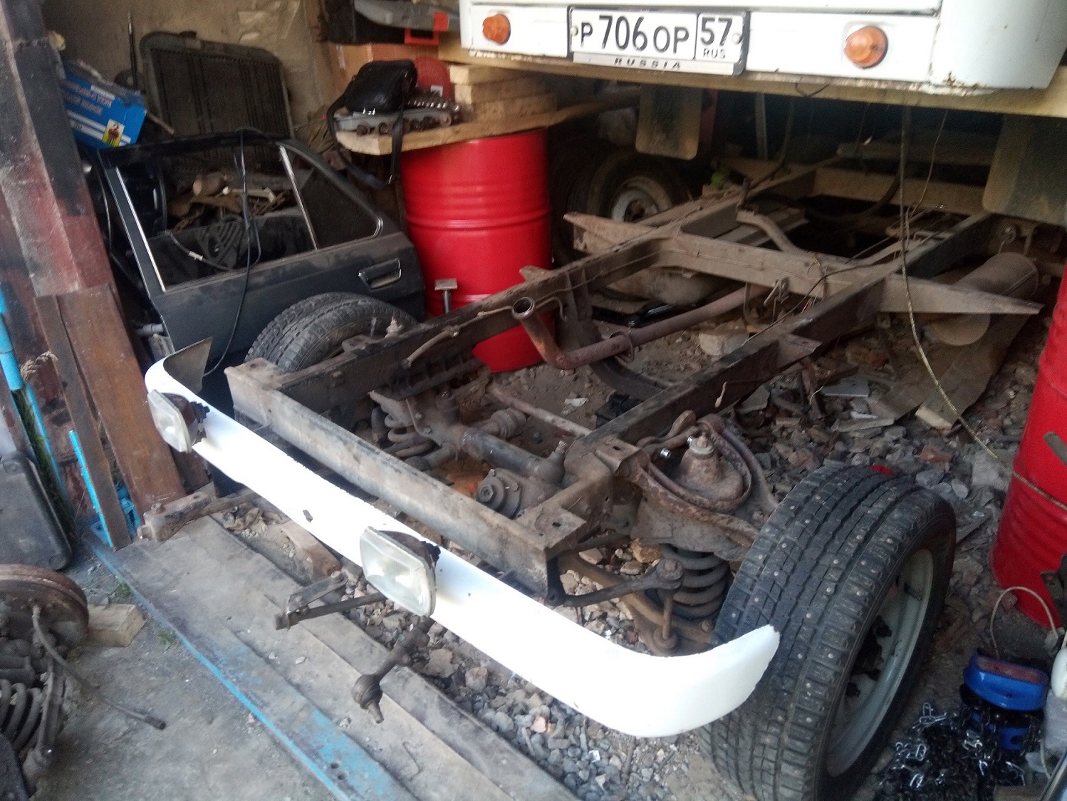 Пока всё идёт по плану. Высоты гаража хватило, чтобы поднять кузов и выкатить раму. Всё разобрано, и на данный момент ведутся работы по монтажу новой подвески, а точнее изготовление крепежей, чтобы прикрутить балку Соболя на штатные крепления родной балки. Забегая вперёд, могу сказать, что пока все получается, но об этом позже, а пока фотки, как машина разбиралась.