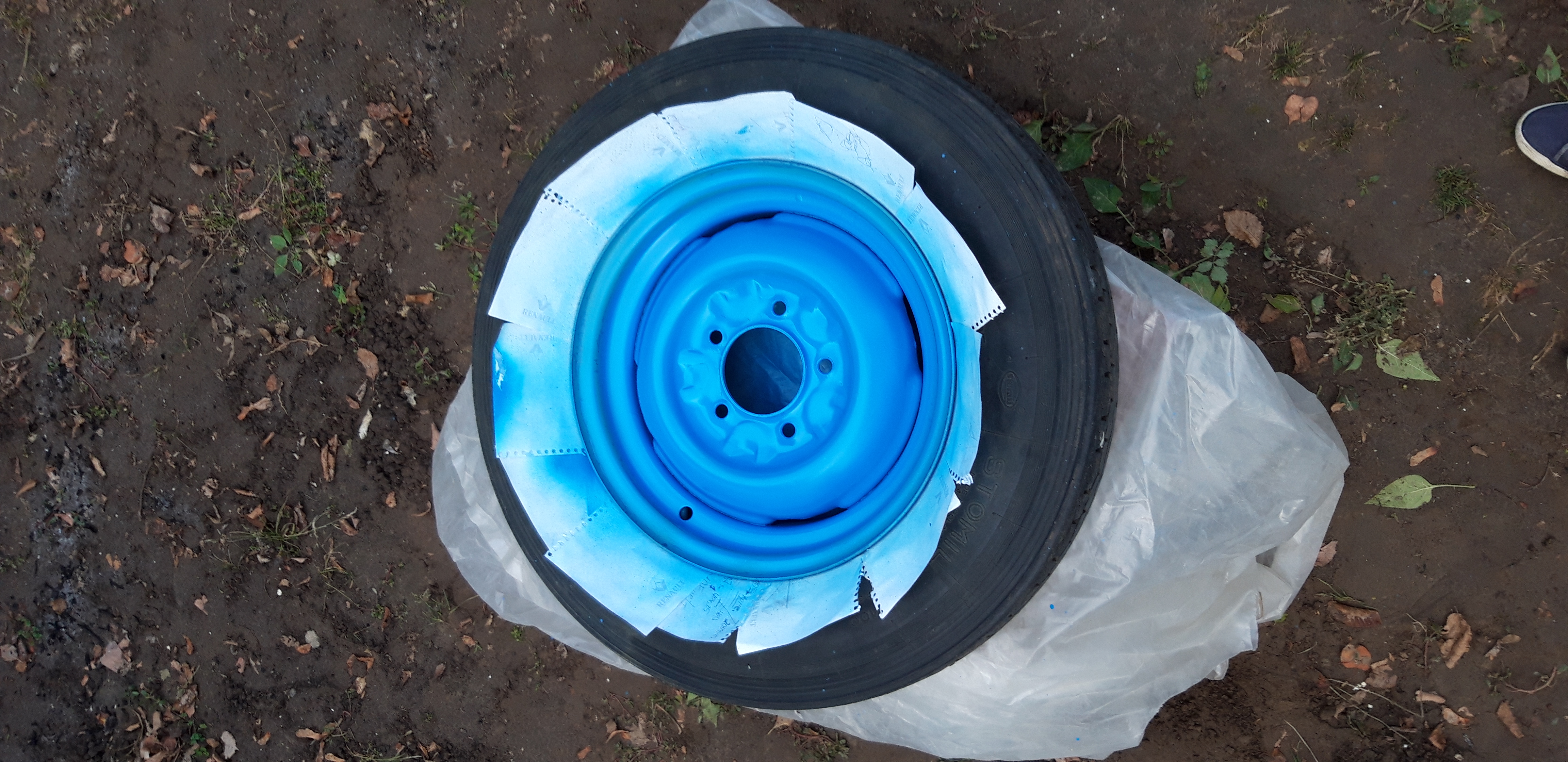 4-е колесо, (предварительно зачищено от ржавчины, обработано вручную грунтовкой), заматовано наждачкой, обезжирено уайт-спиритом, сначала прошелся еще слоем серой грунтовки из аэрозольного балончика для равномерной укладки слоев...