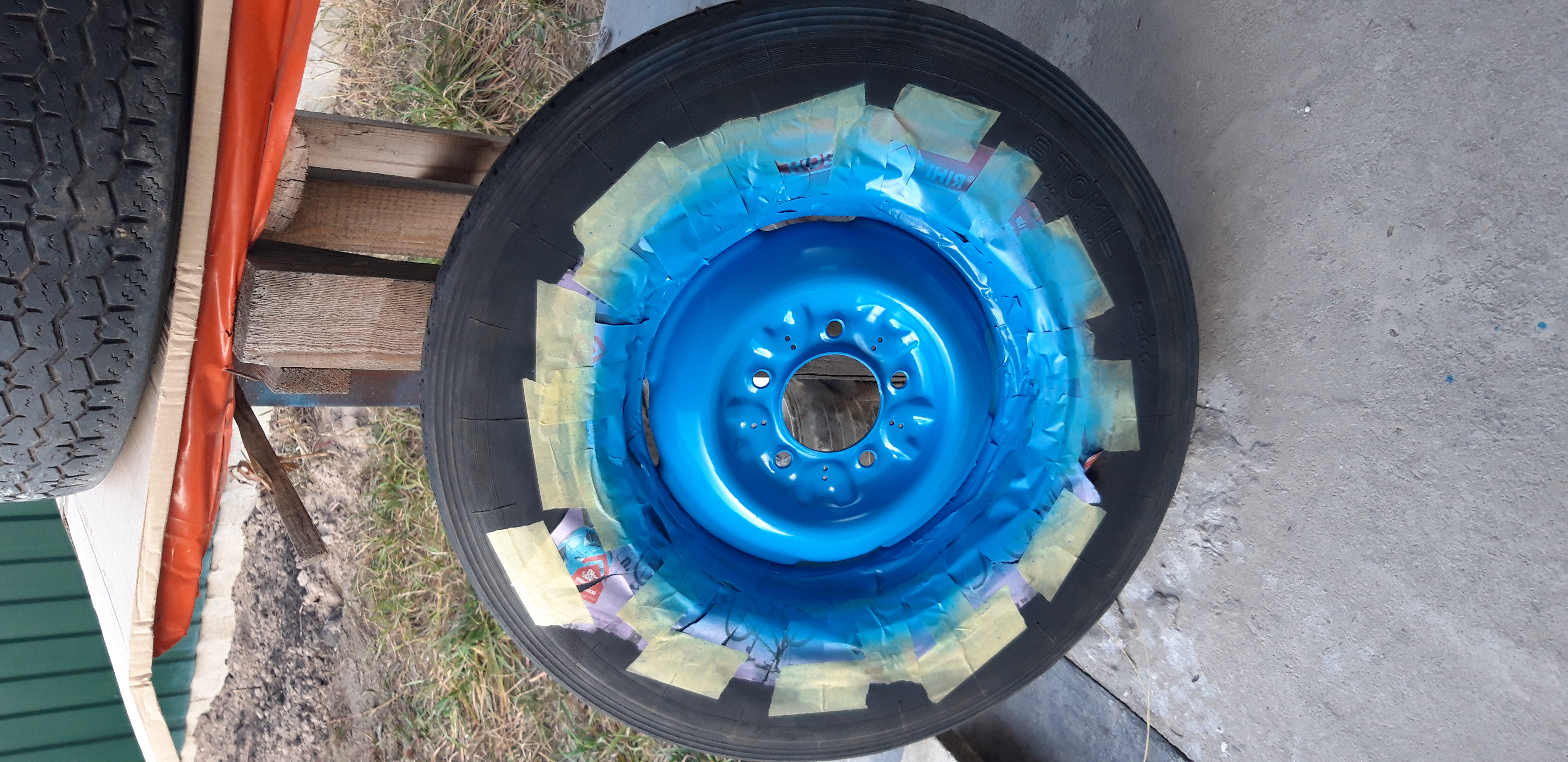 3-е колесо, - заклеена малярным скотчем покрашенная в белый цвет кромка и покрашена середина в голубой цвет.
